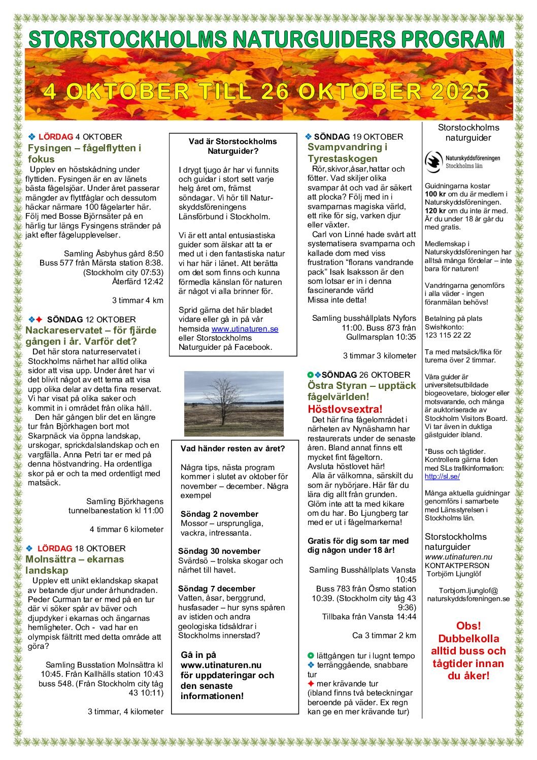Andra turer i oktober går till Nackareservatet, Molnsättra, svampvandring i Tyrestaskogen och Östra Styran i Nynäshamn.